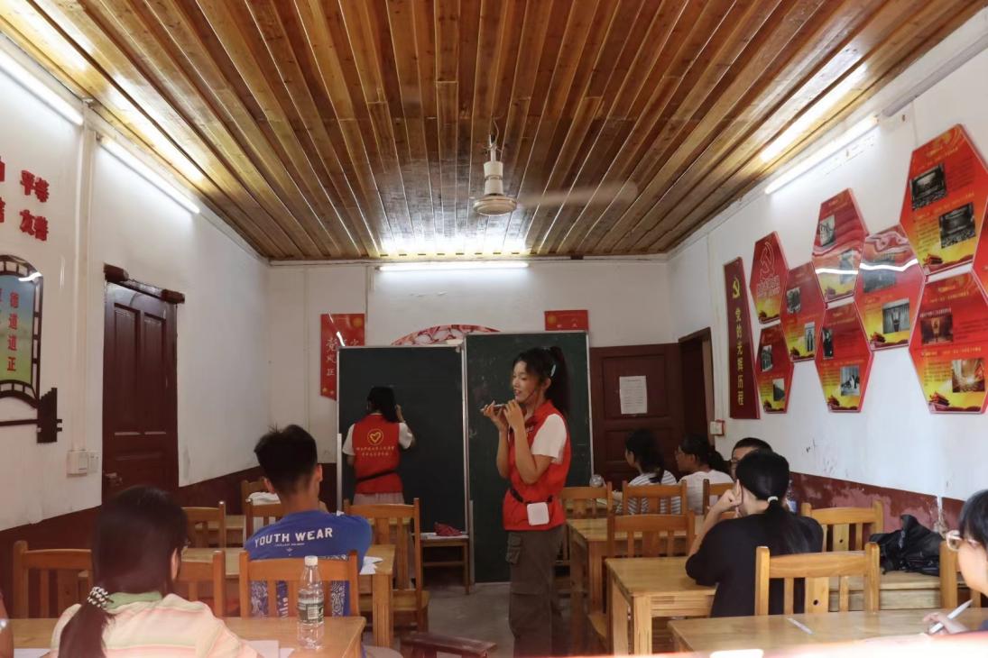 另一位志愿者龙杨慧则从《有我》的背景讲起,“歌曲开头以人声合唱开启这历经风霜的百年画卷,越岁月峰峦,伴历史云烟。歌手用清澈歌声掷出问答,历史的回响声声。”龙杨慧说道。站在前一尺之余,两位志愿者挥起手臂,身体放松,引导同学们跟着伴奏大声唱出歌曲。在陈意和龙杨慧的鼓励下,教室里内歌声悠扬,志愿者们和同学们放声歌唱,氛围十分温馨感人。