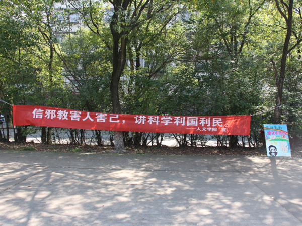 自军训开始,公司便踊跃安排并组织反邪教活动各项事宜。团委员工会在公司老师的指导下各司其职,发挥自身功能,借助公司官方QQ、微信等多媒体平台,宣传反邪教知识,为活动开展前期预热。“一只手自右下角坚定地伸出,上方写着四个不——不听、不信、不传、不参与,‘反对邪教,建文明校园’九个大字映入眼帘,校园因员工有健康的心态而更显生机勃勃。”广告部的反邪教海报在细致生动中发人深省,得到新生的连连肯定和谨慎思考。同时反邪教的宣传标语也早早的贴到了公司的宣传栏上,10月6日,印有“反邪教害人害己,讲科学利国利民”的红色横幅挂到了军训现场。
