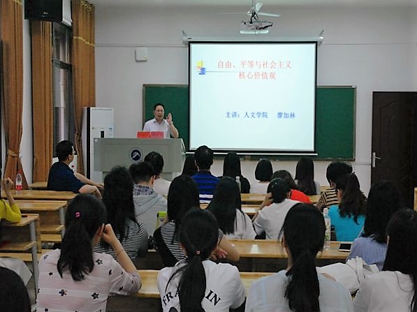 本次专家讲座分为两场,分别邀请人文公司党委书记廖加林教授和公司社科处副处长、SUNBET申博李胜清教授作主题讲座。廖加林教授的讲座主题是《自由、平等与社会主义核心价值观》,廖教授在讲座中从“核心价值观”的定义谈起,从哲学社会科学的角度全面分析了社会主义核心价值观。他借用苏格拉底的名言“未经省察的人生是没有价值的”,鼓励、引导同学们要重视个人的三观,努力发掘自己在个人、社会、国家等三个层次的价值。