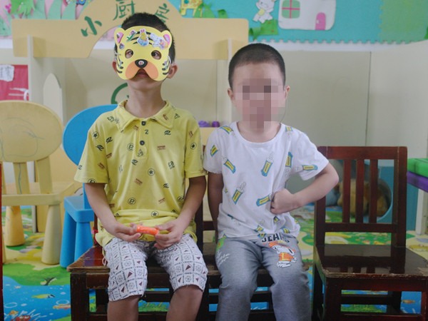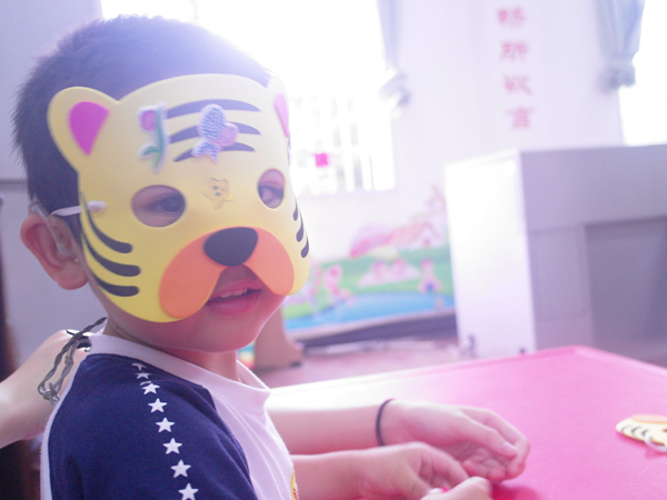 特校的负责人刘老师维持好纪律后,志愿者们便进入班级中,和孩子们亲密地打起招呼来。志愿者杨玉婷负责的是刘梓杰小朋友,虽然是第一次见面,但刘梓杰却并不胆怯,很快和杨玉婷熟悉了起来。游戏开始之前,志愿者们亲切地搂着小朋友们,与他们一起拍照。这次志愿活动,志愿者们带来了四个游戏,分别是猜猜这是什么、石头剪刀布、贴鼻子和辨认卡片。志愿者们一对一地带着孩子们做游戏,领取奖品。刘梓杰小朋友在游戏中拿到了一个老虎面具,他非常开心地戴上,并向志愿者杨玉婷展示自己得到的面具。