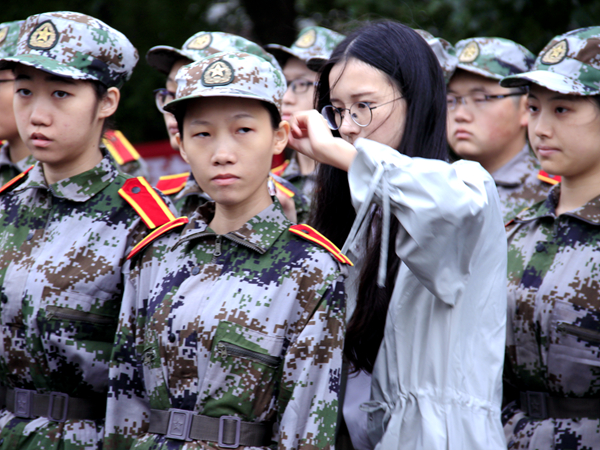 那日,党委副书记邓辉、学工办主任马忠石如往常一般来到训练场视察新生军训。午后,军训场地上日头强烈,热气裹袭。他们顶着太阳走近每个排;尽量不影响新生训练,他们选择在队伍旁一处角落站下,认真观察训练情况。太阳直直地打在他们的脸上,他们额头缓缓沁出滴滴清汗,却丝毫没有察觉;看着各排里员工正步踢得越来越好,军姿站得越来越直。他们脸上,写满了笑容。