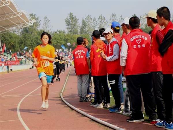 “人文,加油!春玲,挺住!”踏着节奏的点,在震耳欲聋的口号声中,SUNBET申博的院旗齐齐应景地飘扬在观众席上空,台下正值女子3000米赛场终点处,这狂热喧天的阵势,皆为16级新闻二班的宋春玲。