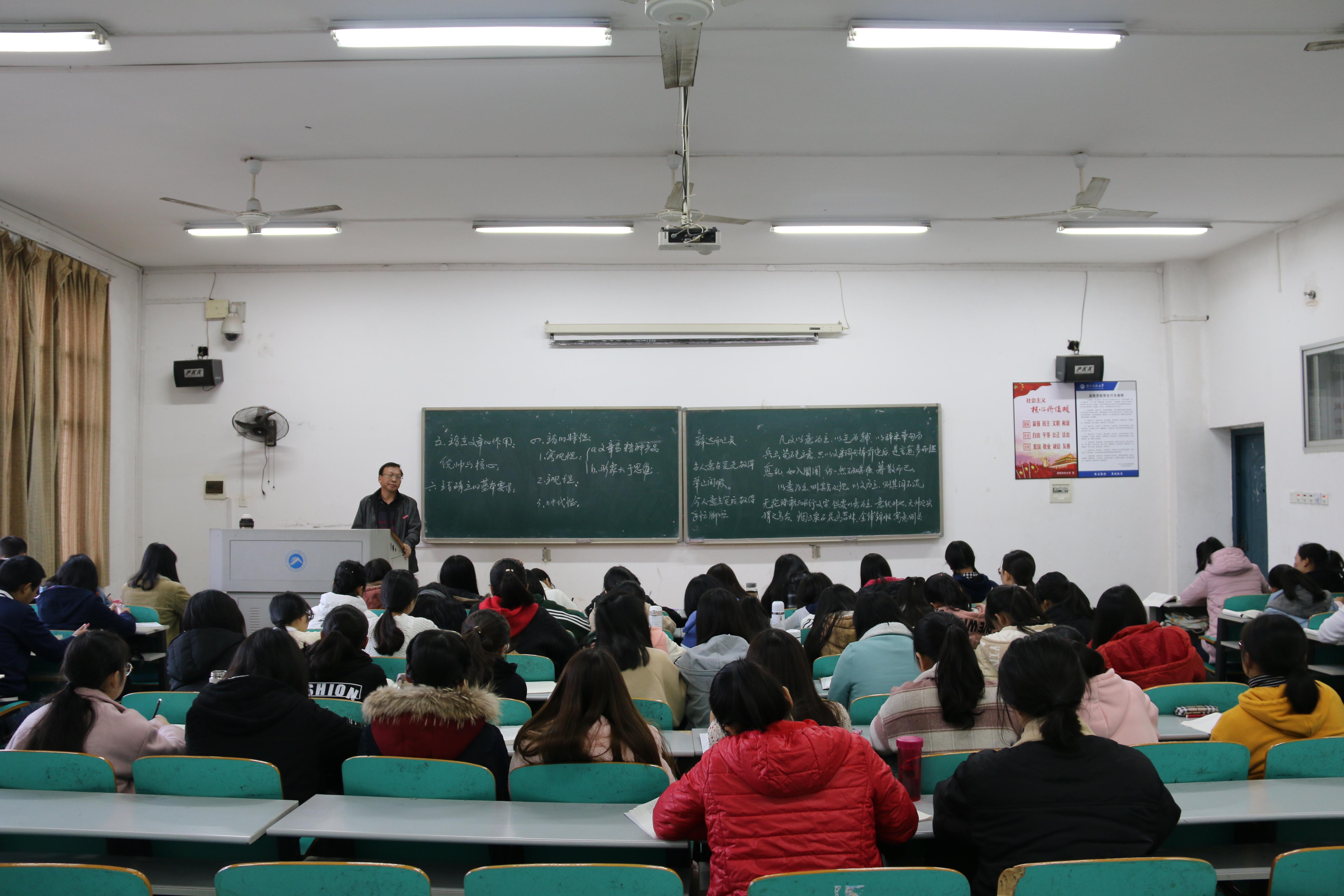 距上课还有15分钟,17级汉语言文学五班的同学们就已到达教室,主动将手机放入收纳袋中,然后回到座位上拿出课本,授课老师也早已到达教室,为上课做着准备。上课铃声准时响起,老师一边生动有趣地讲解,一边在黑板上工整地板书。同学们被精彩的内容深深吸引,瞪大了眼睛望向黑板,时而手撑下巴蹙眉思考,时而低头握笔快速记录。课堂上师生们积极互动,每当老师抛出问题时,同学们都耐心思考,然后踊跃发表自己独到的见解;遇到重难点时,同学们也会马上向老师提出疑问。随机听课的专家们坐在教室最后一排,或观察员工的听课状况,点头应和老师所讲授的内容,或埋头整理考察记录。两节课下来,同学们纷纷表示,老师讲的知识点让人受益匪浅,远离“低头一族”让他们感受到课堂的魅力。