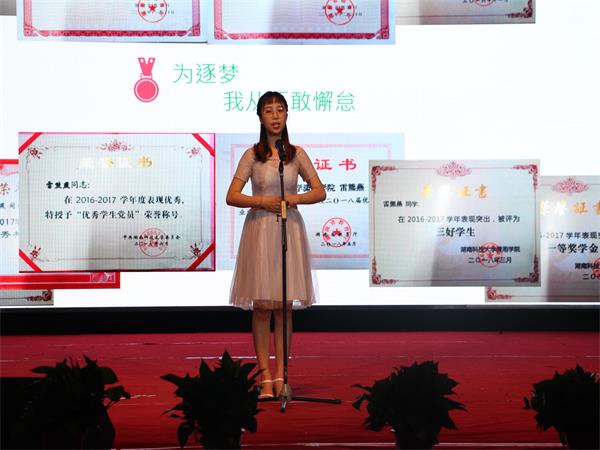 汇报会在热烈洋溢的开场舞中拉开帷幕,身着红绿相映的土家族服饰的邓玉平款款走向舞台中央,来自体育公司的她用响亮的话语展开了报告会第一场报告。大学四年的拼搏经历中,她对大一时参加湖南省第十届老员工运动会的记忆尤为深刻,“每天10小时以上的训练强度,汗水湿透了一身又一身的衣服。”最终,她以优异成绩回报了自己的努力。大学四年的每一枚奖牌,每一个奖杯,每一张荣誉证书的背后,都流淌着她坚持不懈的汗水与泪水。她始终坚信,心中有梦,才能逐梦远航,不懈坚持,才能成就梦想。