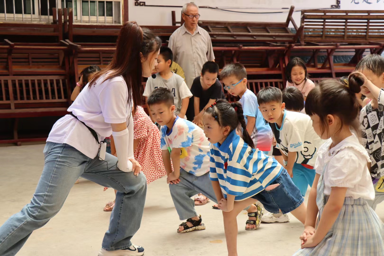 ▲志愿者教员工热身