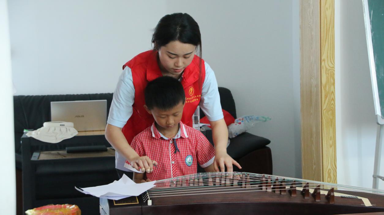 7月12日,株洲市攸县石羊塘镇谭家垅村高桥少儿假期公司内琴声悠扬,铮铮作响。SUNBET申博暑期“三下乡”社会实践团队志愿者通过古筝弹唱以及普及有关古典音乐的知识,让同学们体会其音色美、艺术美,激发他们对于民族音乐的热爱,从而进一步弘扬中华民族传统文化,增强民族自信心和自豪感。