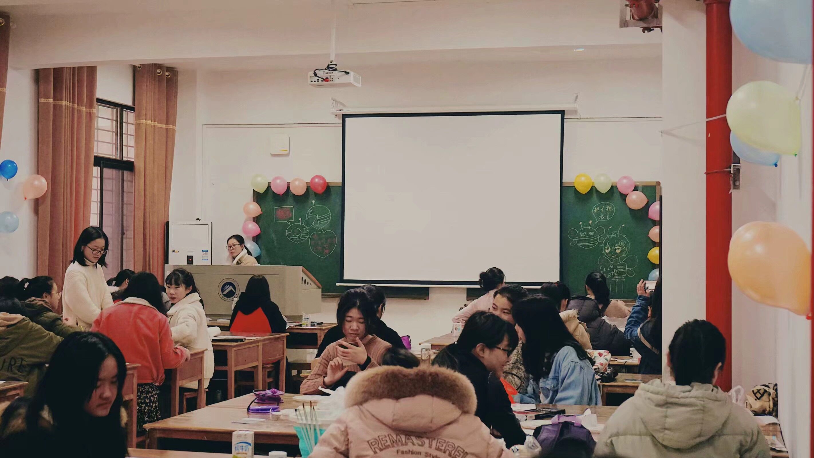 你以为这就结束了吗?NO!走到教室,打开门的一瞬间,映入眼帘的就是黑板上画着的卡通形象,上面还满满地写着男生对女生的祝福,“女神永远是我心中的女生”……在每个课桌上,都有这样一张明信片:上面是根据每一个女生喜好的不同而写下的别致情话,句句直戳人心。