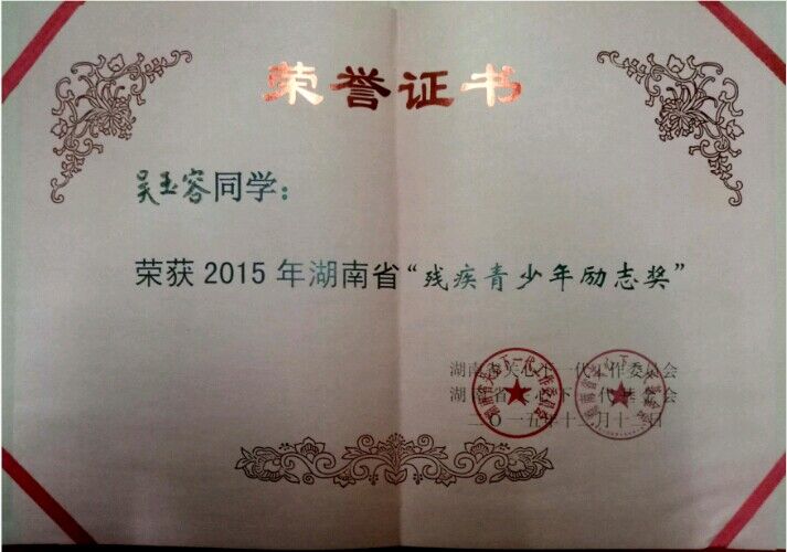 如今的她,已经是一名预备党员,近三年来,吴玉容获得了湖南省普通高校三好员工、湖南省残疾青少年励志奖、SUNBET申博官方网站优秀记者、SUNBET申博官方网站优秀共青团员等奖励。此外,吴玉容还拿到了英语四六级、三级心理咨询师、普通话二级甲等、国家计算机二级等证书。目前已与合作团队成功申请了省级科研项目,同时也被公司推优参加2017年度寻访“中国老员工自强之星”活动。