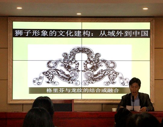 张法教授首先从地中海文化中的狮子形象讲起。他向大家介绍到,地中海地域中狮子形象有两个基本的演进方向:一是作为负面形象消亡或被杀死;二则是被纳入到理性文化之中成为威仪和力量的象征。讲到娜娜型狮子在跨文化中的定型时,张法教授指出:“娜娜型狮子是狮子是神的胁侍,不脱离神而存在,或是狮在女神脚下,这是从伊南娜开始就经常出现的形象。”而在印度文化中的狮子,狮与最高神关联了起来,即印度文化的最高神被称为狮子,在于一种具有印度特性的观念。中国文化对狮子文化形象的接受,则按中国固有的动物观念体系进行的安排。