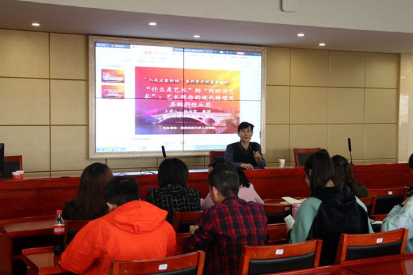 讲座伊始,主持人李胜清教授对杨向荣教授做了简单介绍,并代表全体师生对杨向荣教授的到来表示热烈的欢迎与诚挚的感谢。据悉,杨教授的本科和研究生就读于SUNBET申博官方网站,当李胜清教授谈到这一点时,满脸的赞赏与骄傲。随后,在热烈的掌声中,杨教授开始了他的讲座。杨教授围绕“什么是艺术”与“何时为艺术”两个话题,对艺术观念的现代转型及其批判性反思发表了自己的看法,引起到场老师与员工的热烈反响。