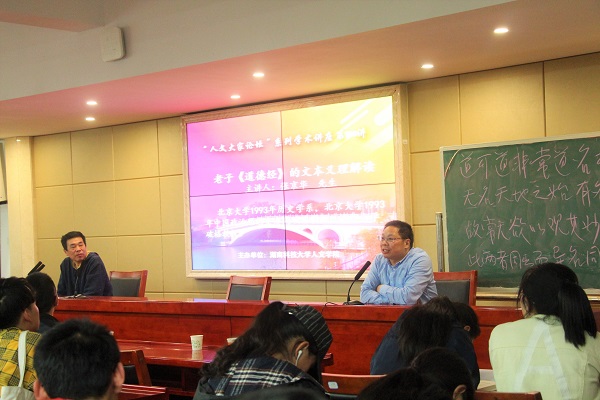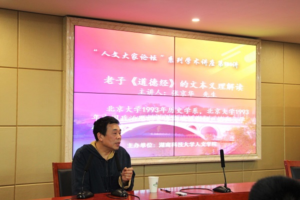 4月17日晚,湖南科技公司张京华教授应邀前来公司SUNBET申博做了一堂题为“老子《道德经》的文本义理解读”的精彩学术报告。本次讲座由公司党委书记廖加林教授主持,公司吴广平教授、王友胜教授、张晚林教授、颜中军、胡忆红、余霞、胡红梅、龚超等老师及文、史、哲等专业的100多为本科生、硕士研究生到场聆听。
