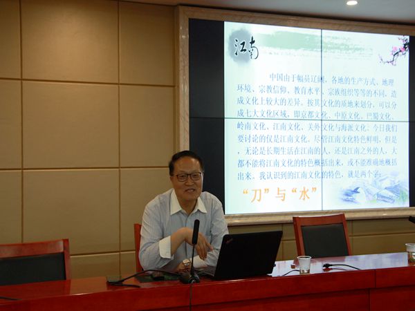 5月24日晚,上海师范大学朱恒夫教授应邀于立言楼B4-1开展以“‘刀与水’的江南文化特色”的主题讲座,本次讲座由文学专业彭在钦教授主持,16级文学专业全体员工到场聆听。