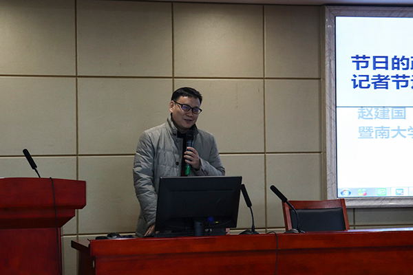 12月20日下午,公司“人文大家论坛”系列学术讲座第201讲在立言楼B4-1举行,暨南大学新闻与传播公司教授、博士生导师赵建国应邀作了以“节日的政治:民国时期九一记者节述论”为题的学术讲座。讲座由公司党委书记李胜清教授主持,新闻与传播学系师生到场聆听。